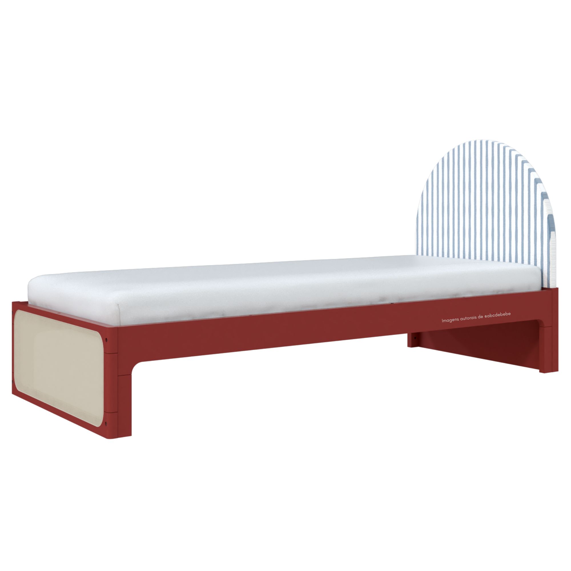 A cabeceira estofada é revestida em tecido, adicionando charme e suavidade ao conjunto. Já a estrutura da cama é fabricada em eucalipto tratado, lavado e seco em estufa, disponível no tom de tauari natural ou em versões coloridas.