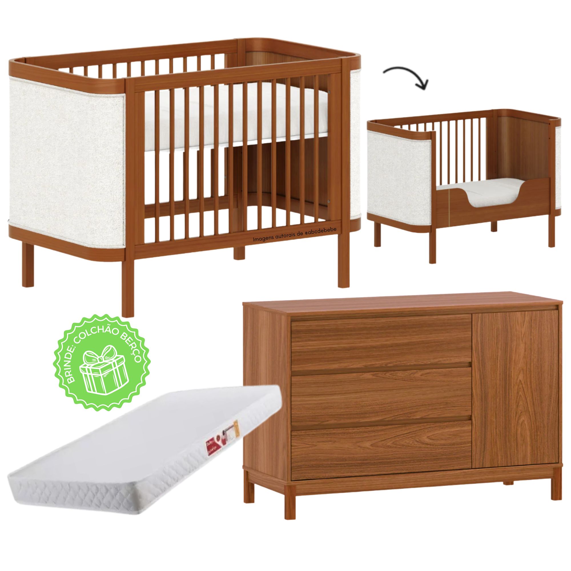 💖 O Conjunto Berço 2 em 1 Soley + Cômoda Soley na cor Nogueira Freijó é a combinação perfeita entre elegância, conforto e praticidade — com design premium, acabamento em bouclé e um colchão de brinde para deixar o quartinho ainda mais completo!