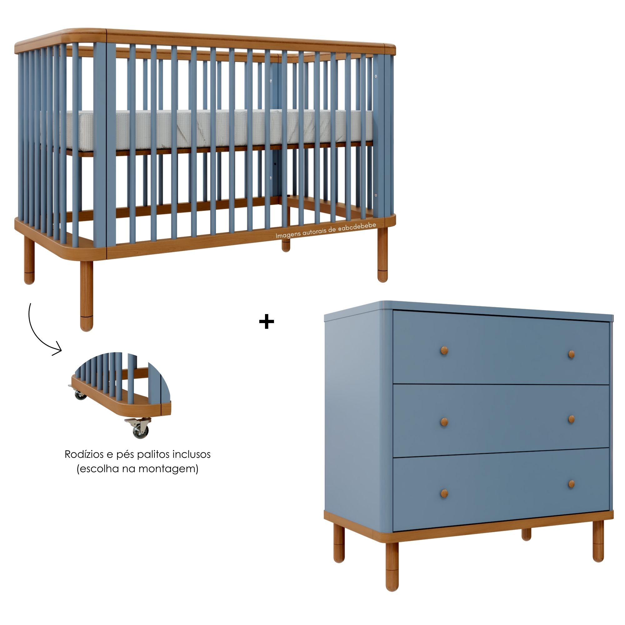 Conjunto Berço + Cômoda Joy - Azul Sereno / Madeira