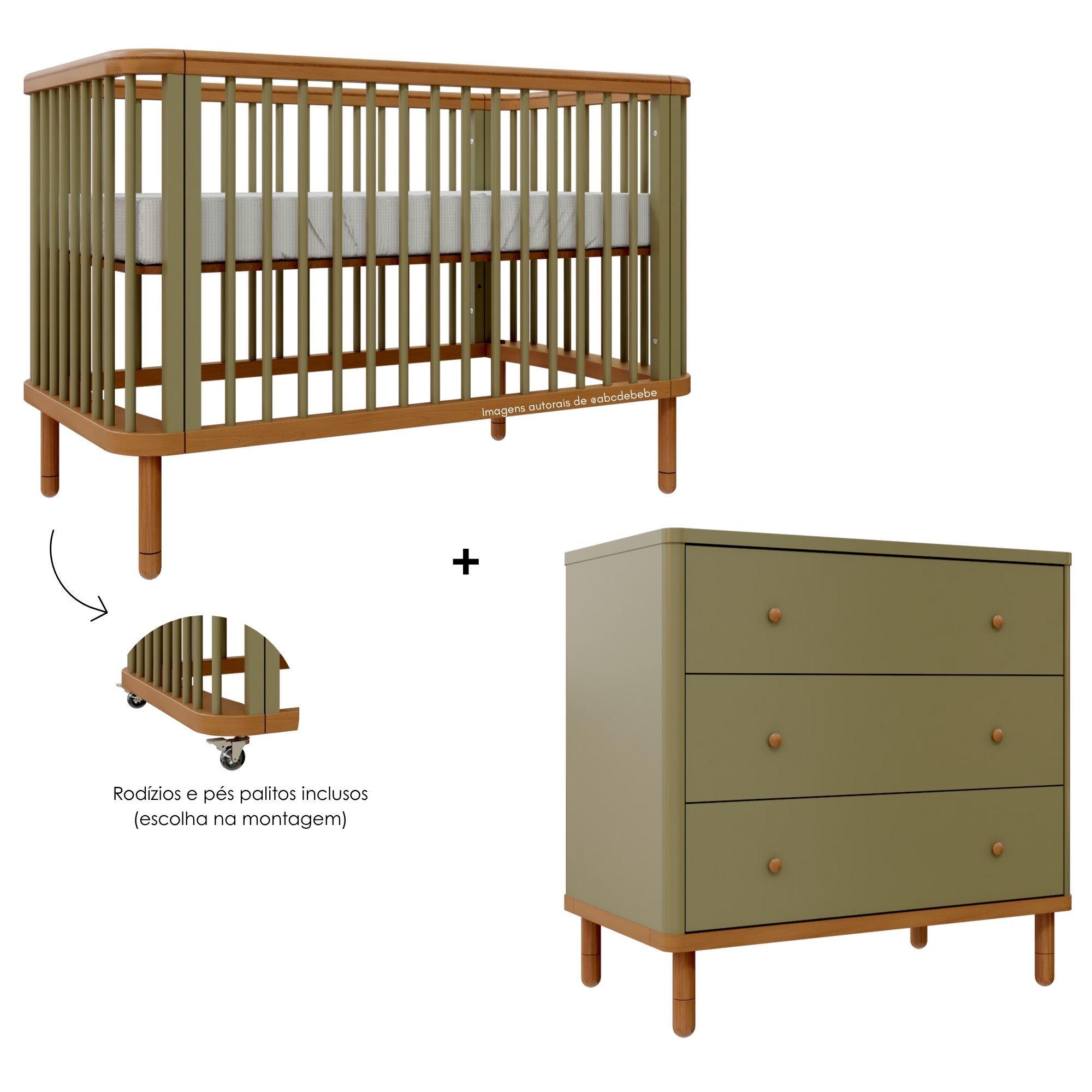 Conjunto Berço + Cômoda Joy - Cacto / Madeira