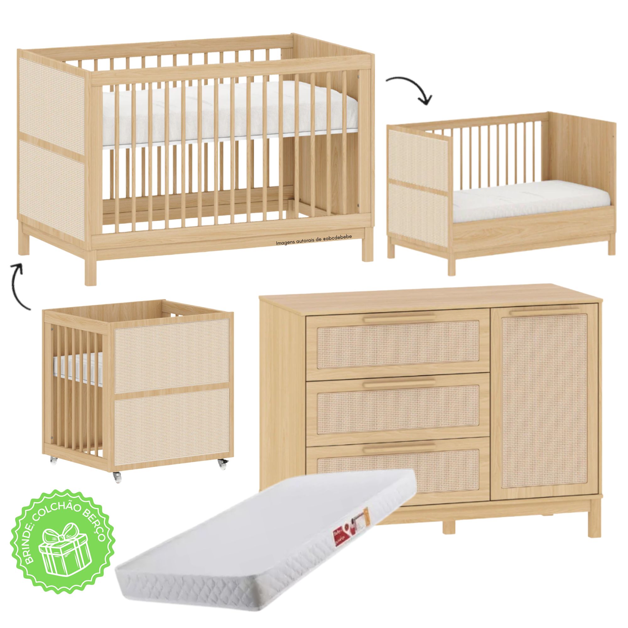 💖 O Conjunto Berço Evolutivo 3 em 1 Indy + Cômoda Indy é a escolha perfeita para quem busca um quarto encantador, seguro e sofisticado — com acabamento em rattan, design contemporâneo e um colchão de brinde para completar o conforto do seu bebê!
