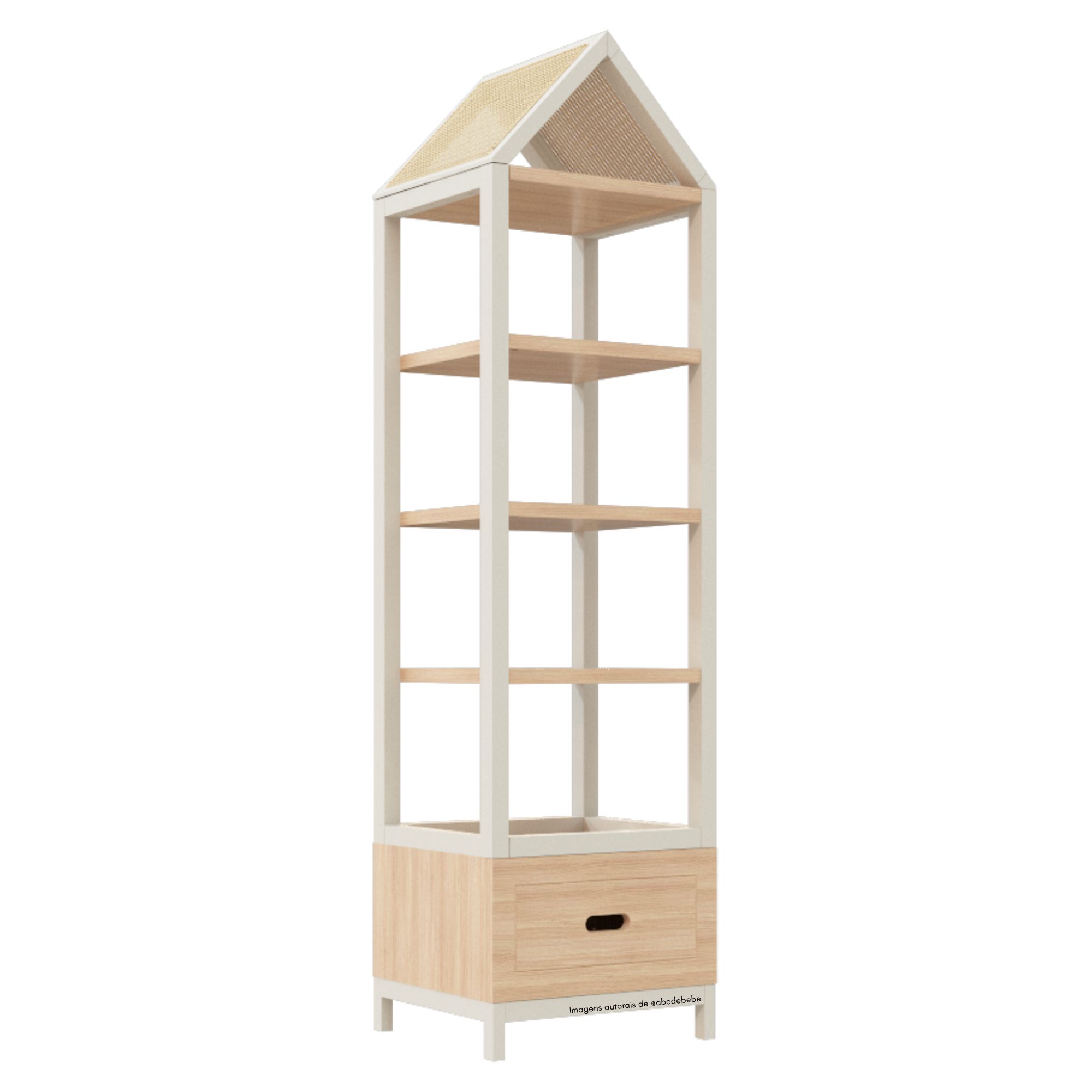 Com módulos bem distribuídos, a estante possui 4 nichos e 1 gaveta espaçosa, ideais para organizar brinquedos, livros e objetos decorativos, mantendo o quartinho sempre em ordem. O telhado artesanal em eucalipto pranchado com acabamento em palha natural adiciona charme e leveza, tornando o móvel uma peça de destaque em qualquer ambiente infantil 🌿.