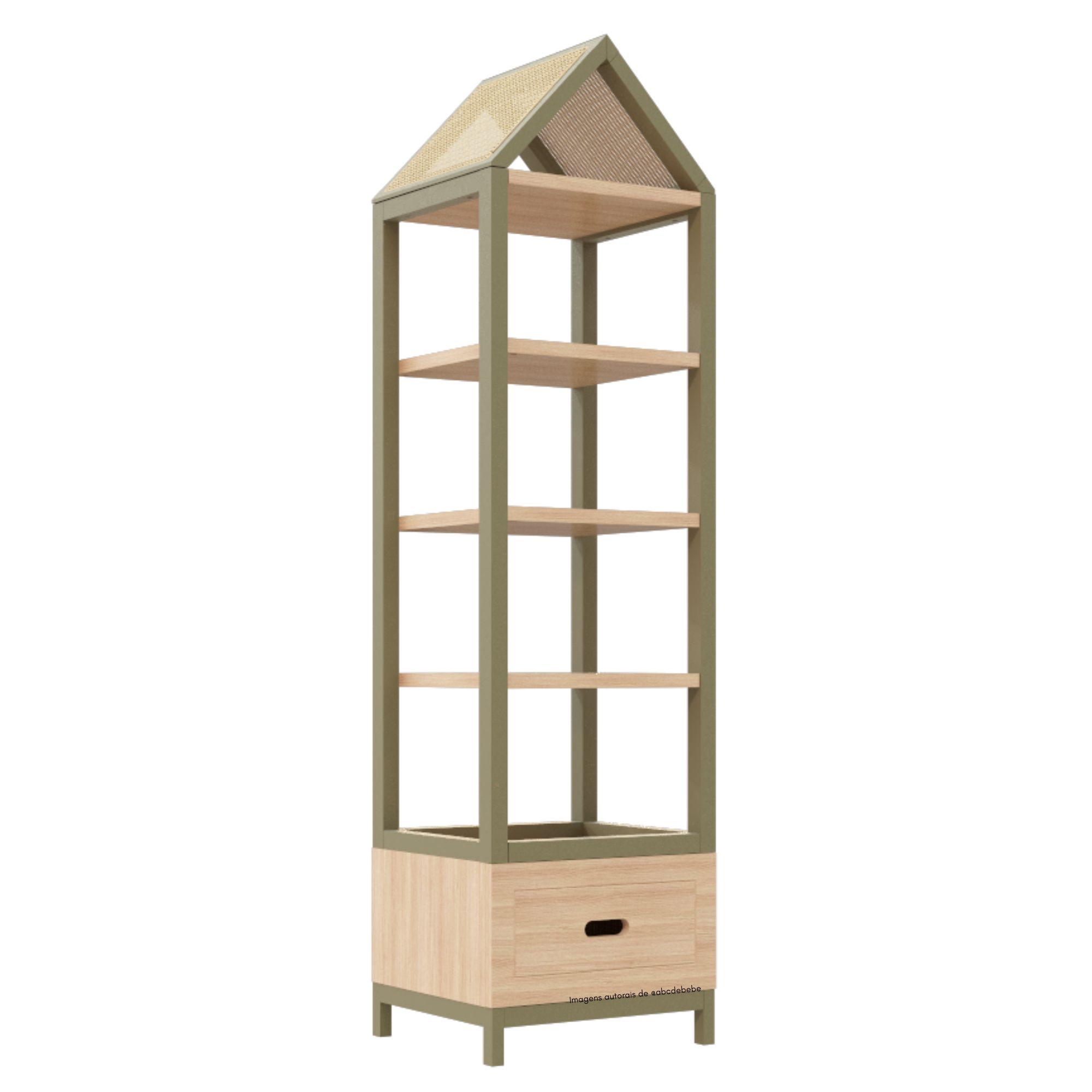 Com módulos bem distribuídos, a estante possui 4 nichos e 1 gaveta espaçosa, ideais para organizar brinquedos, livros e objetos decorativos, mantendo o quartinho sempre em ordem. O telhado artesanal em eucalipto pranchado com acabamento em palha natural adiciona charme e leveza, tornando o móvel uma peça de destaque em qualquer ambiente infantil 🌿.