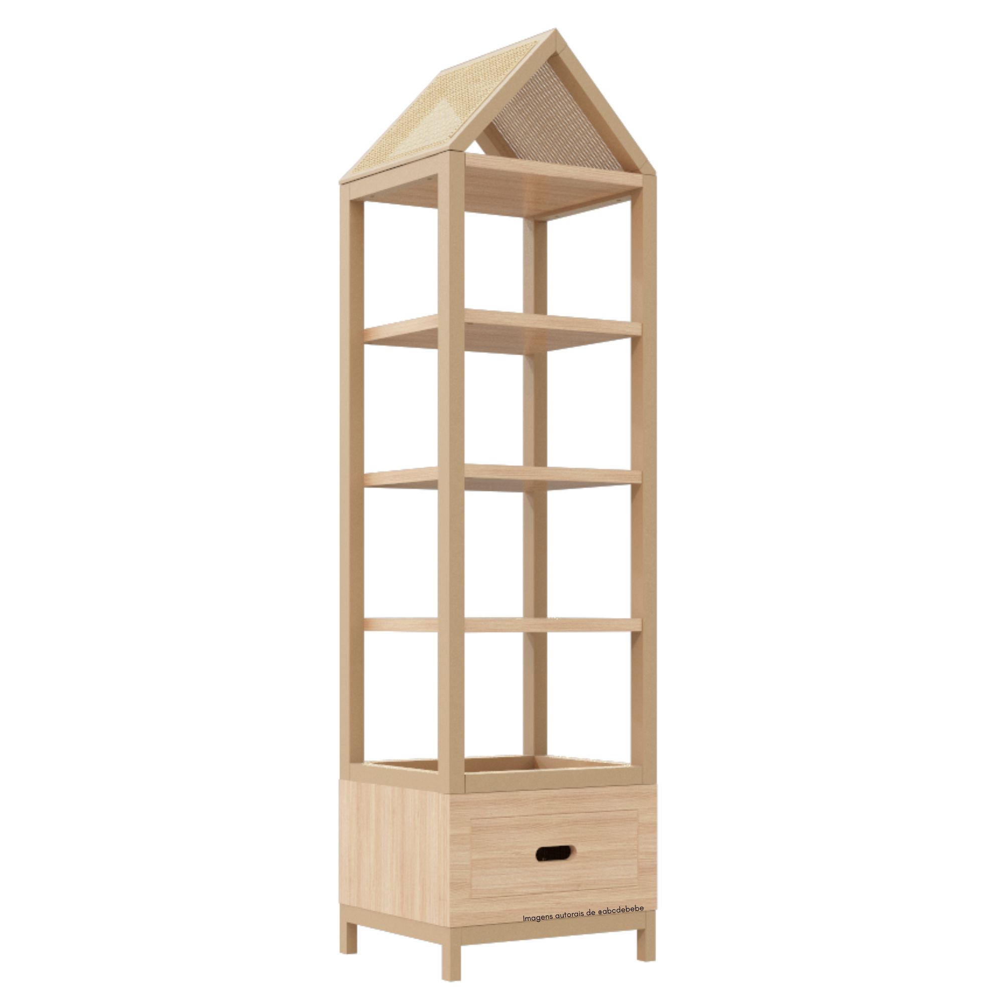 Com módulos bem distribuídos, a estante possui 4 nichos e 1 gaveta espaçosa, ideais para organizar brinquedos, livros e objetos decorativos, mantendo o quartinho sempre em ordem. O telhado artesanal em eucalipto pranchado com acabamento em palha natural adiciona charme e leveza, tornando o móvel uma peça de destaque em qualquer ambiente infantil 🌿.