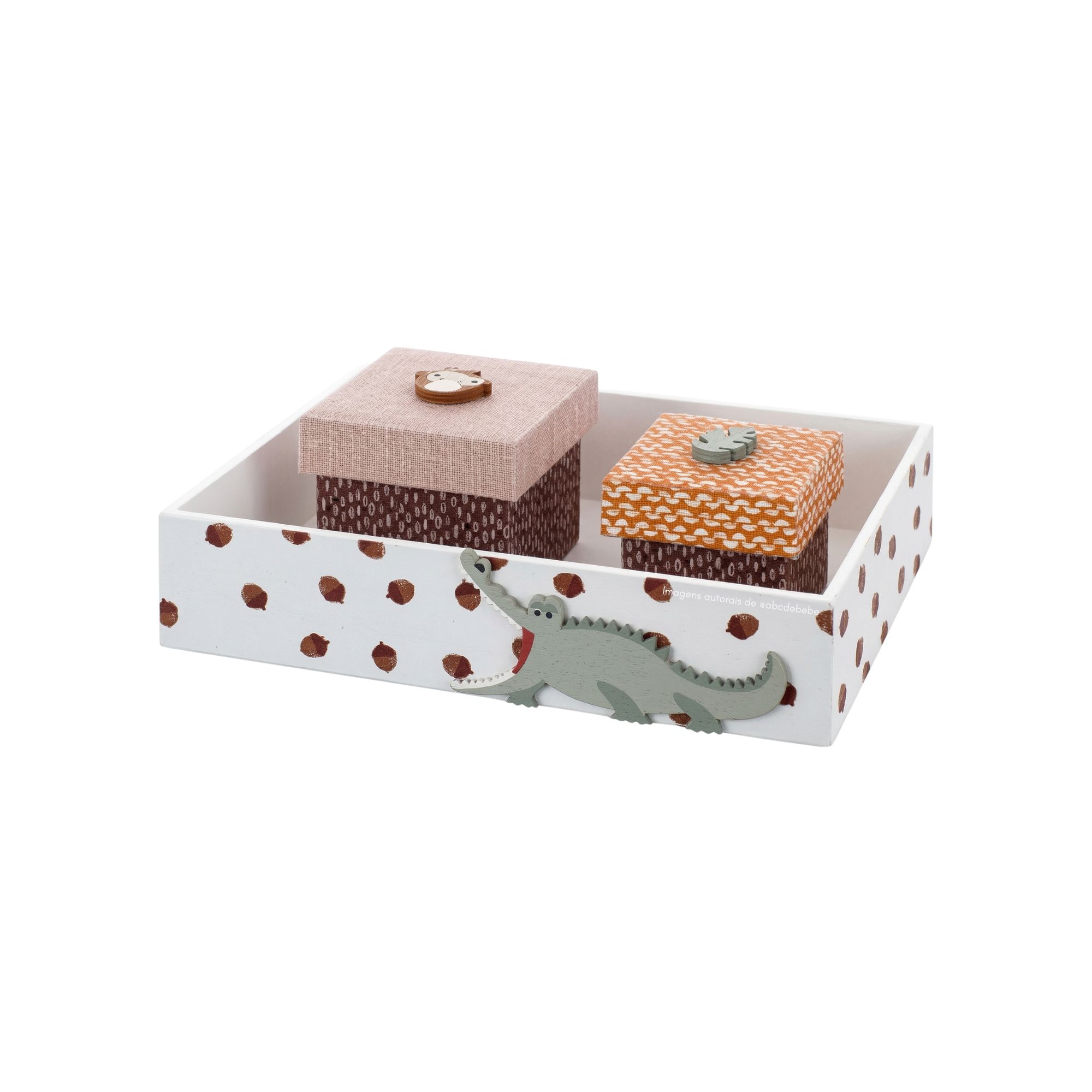 - Medidas: Bandeja (33x23x7 cm); Caixa maior (10x10x10 cm); Caixa menor (8x8x8 cm)