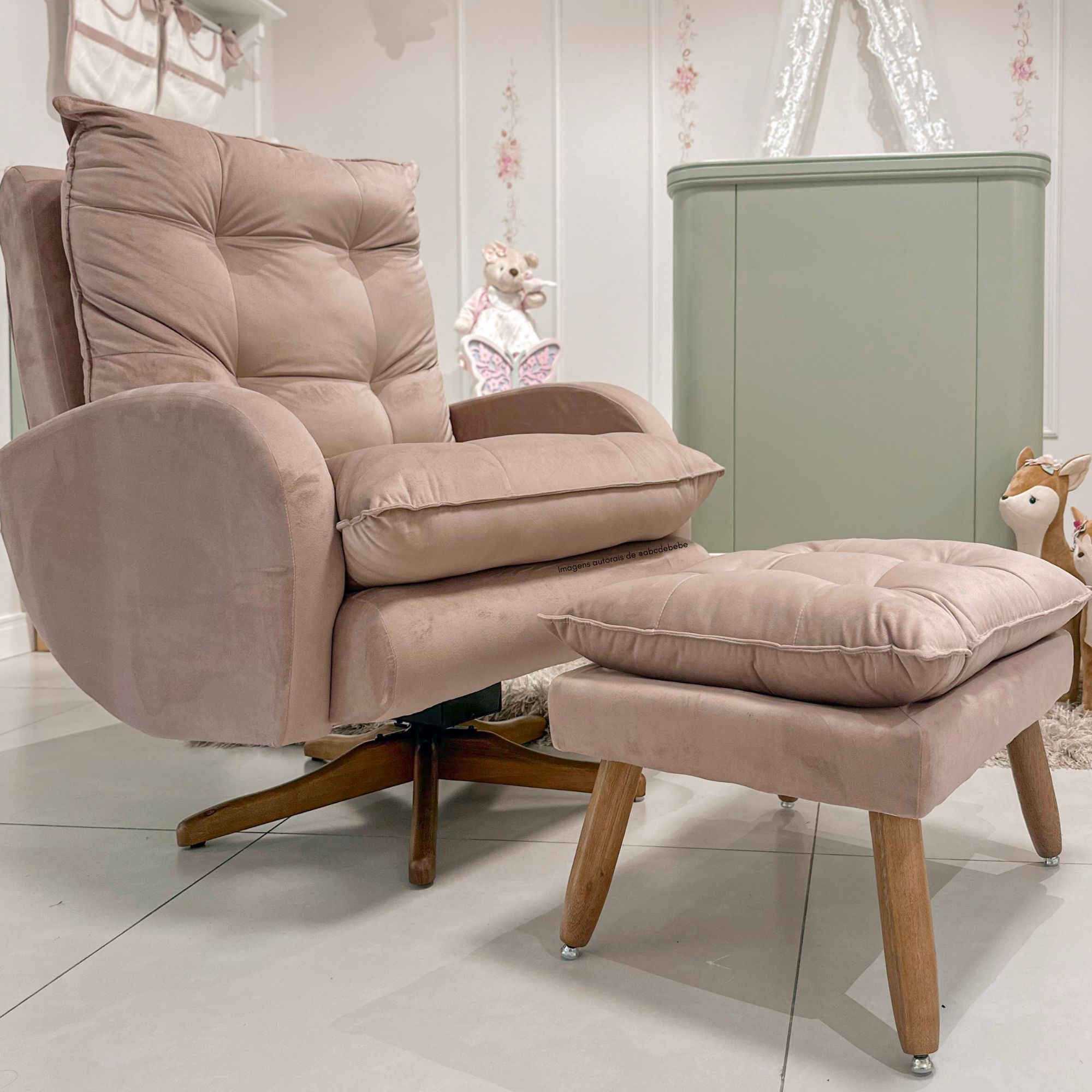 Poltrona De Amamentação Clarisse - Com Balanço e Giro - Com Puff Pé Palito - TB111 - Veludo Rose Claro - prontaentrega