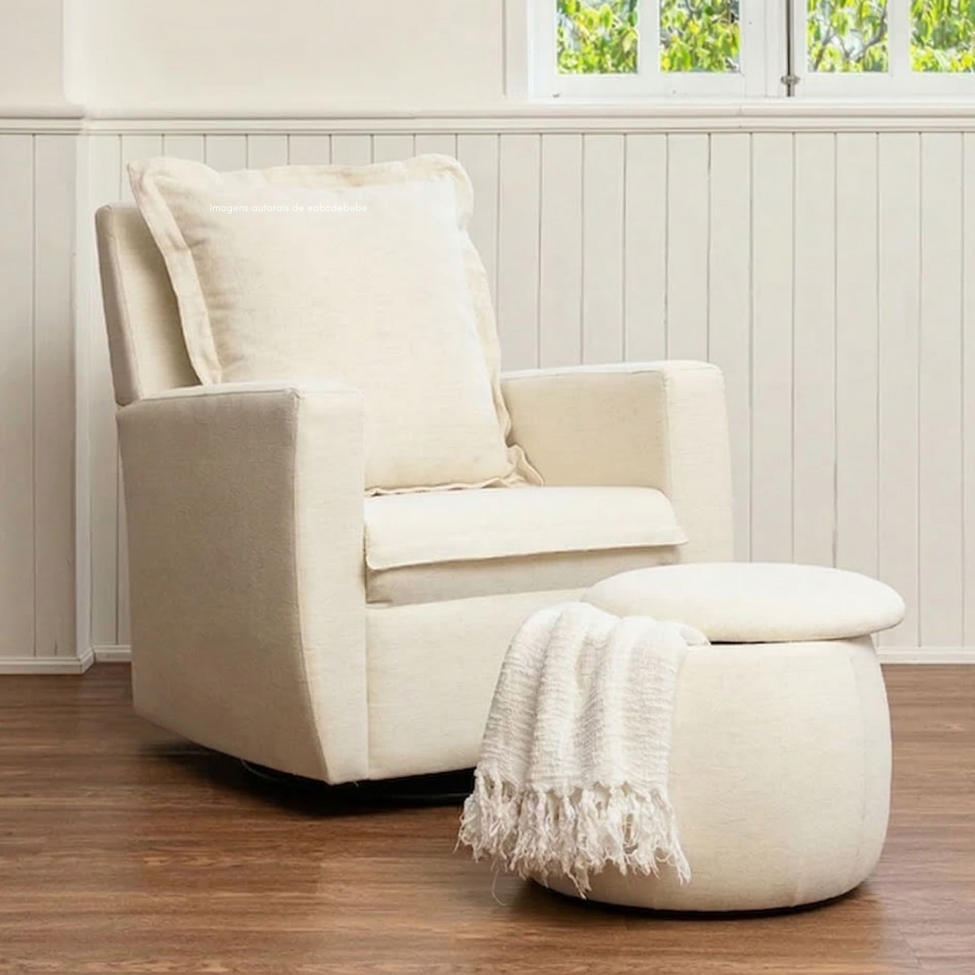 Poltrona de Amamentação Serena com Puff Baú – Giro, Balanço e Conforto