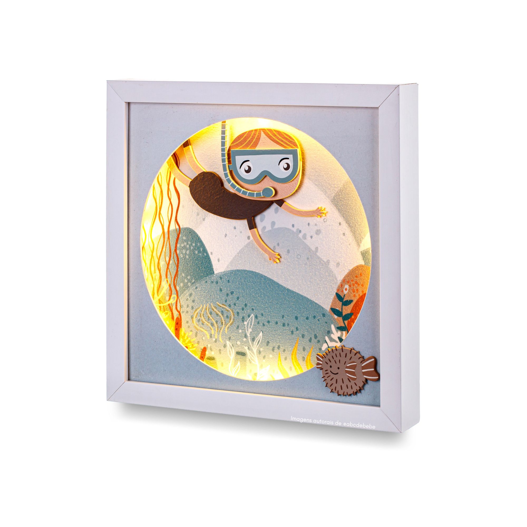 Quadro com Luz LED Mergulhador é aquela peça encantadora que traz delicadeza, afeto e um toque lúdico para decorar o quartinho do bebê com muito carinho.