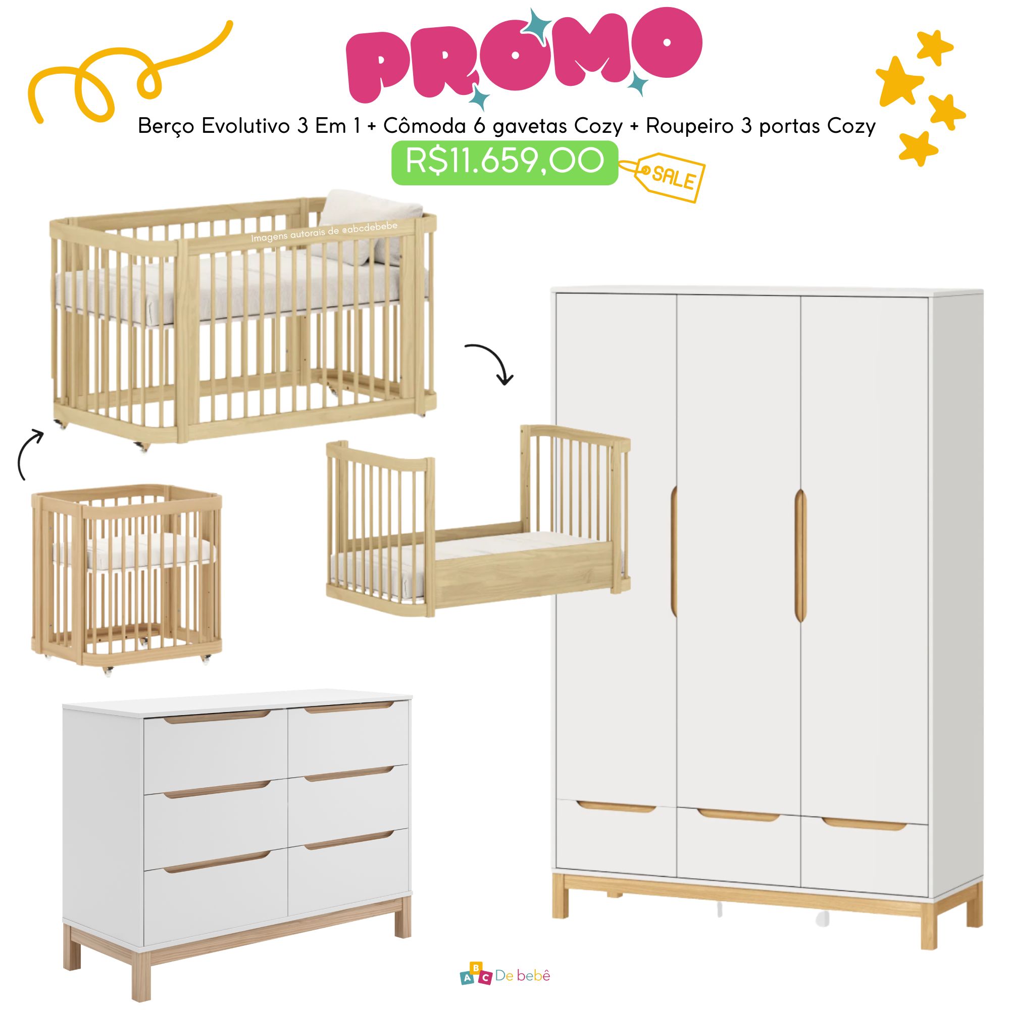 Berço evolutivo com excelente custo-benefício, pensado para acompanhar o crescimento do bebê: começa como mini berço (ideal para os primeiros meses), transforma em berço americano com 3 regulagens de altura do colchão e, depois, vira mini cama para uso até aproximadamente 4–5 anos (de acordo com o desenvolvimento da criança). Conta com rodízios em gel com trava para facilitar a locomoção, cantos arredondados e pintura atóxica. Fabricado em madeira Pinus, é certificado pelo INMETRO (009408/2023) e suporta em média 60 kg.