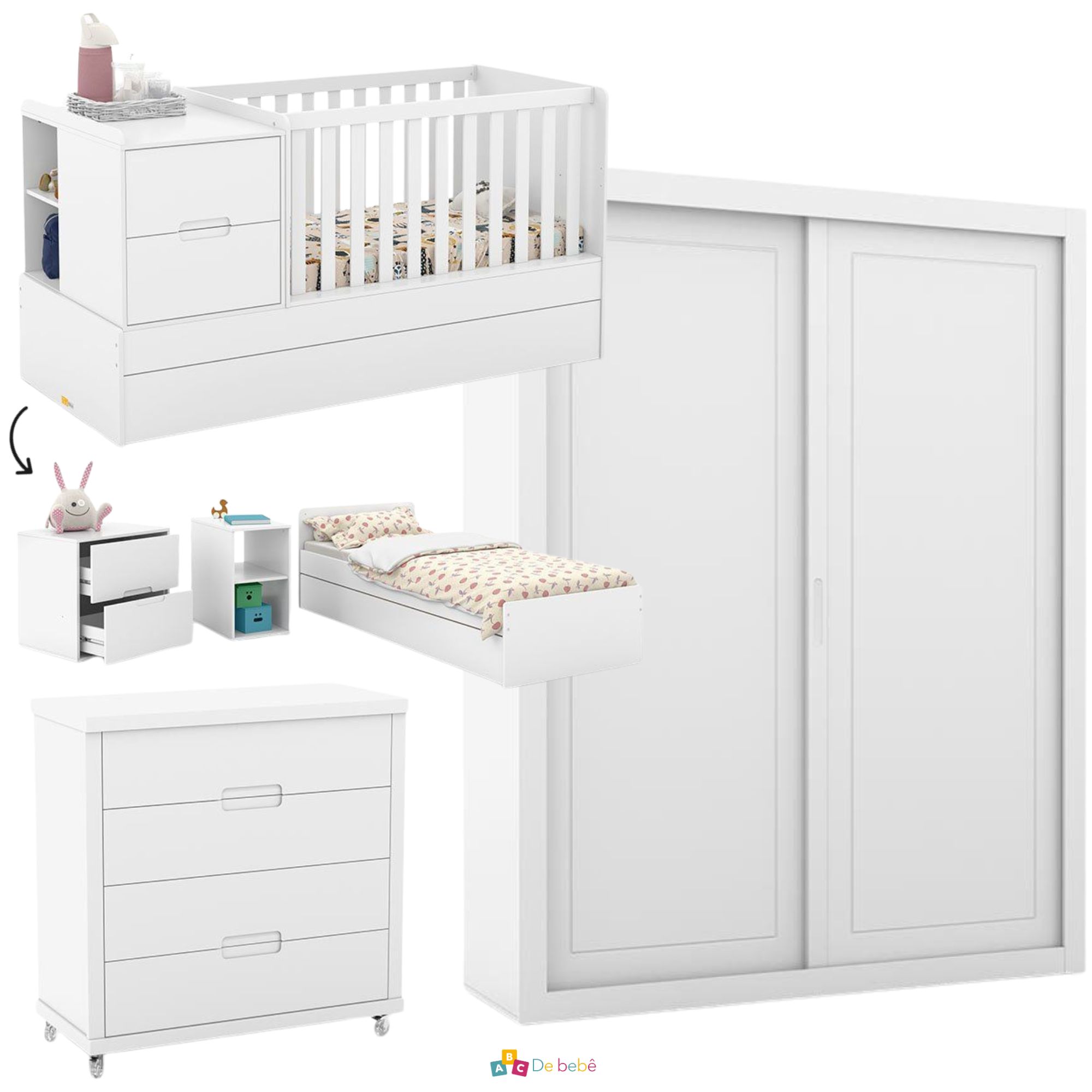 O Berço Formare se transforma em mini cama, cama, cama auxiliar, escrivaninha, mini cômoda e nicho, além de contar com trocador e cama auxiliar inclusa, acompanhando diferentes fases da infância.