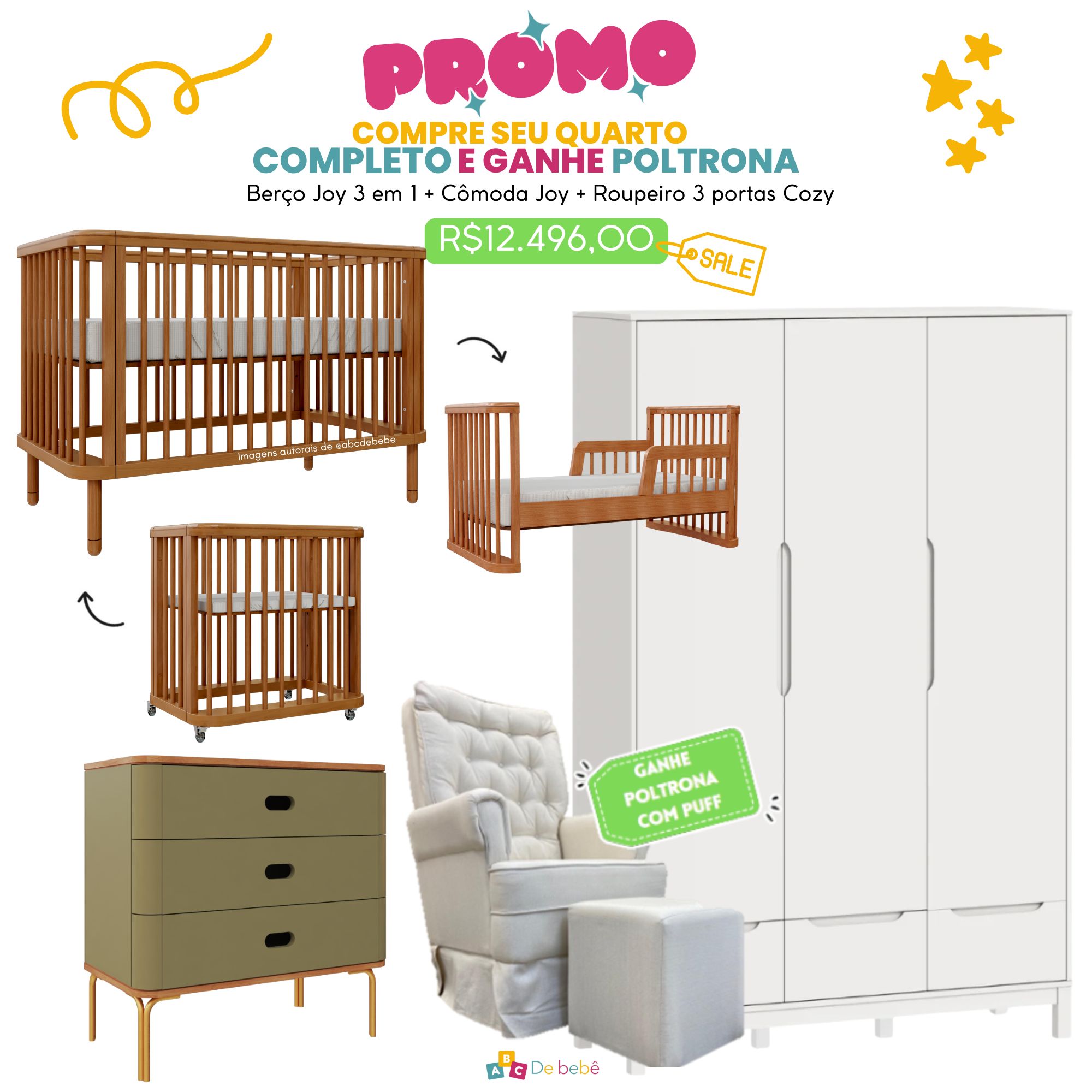 Um quartinho completo com visual leve e contemporâneo, ideal para quem busca versatilidade, segurança e praticidade, acompanhando o bebê do nascimento à primeira infância.