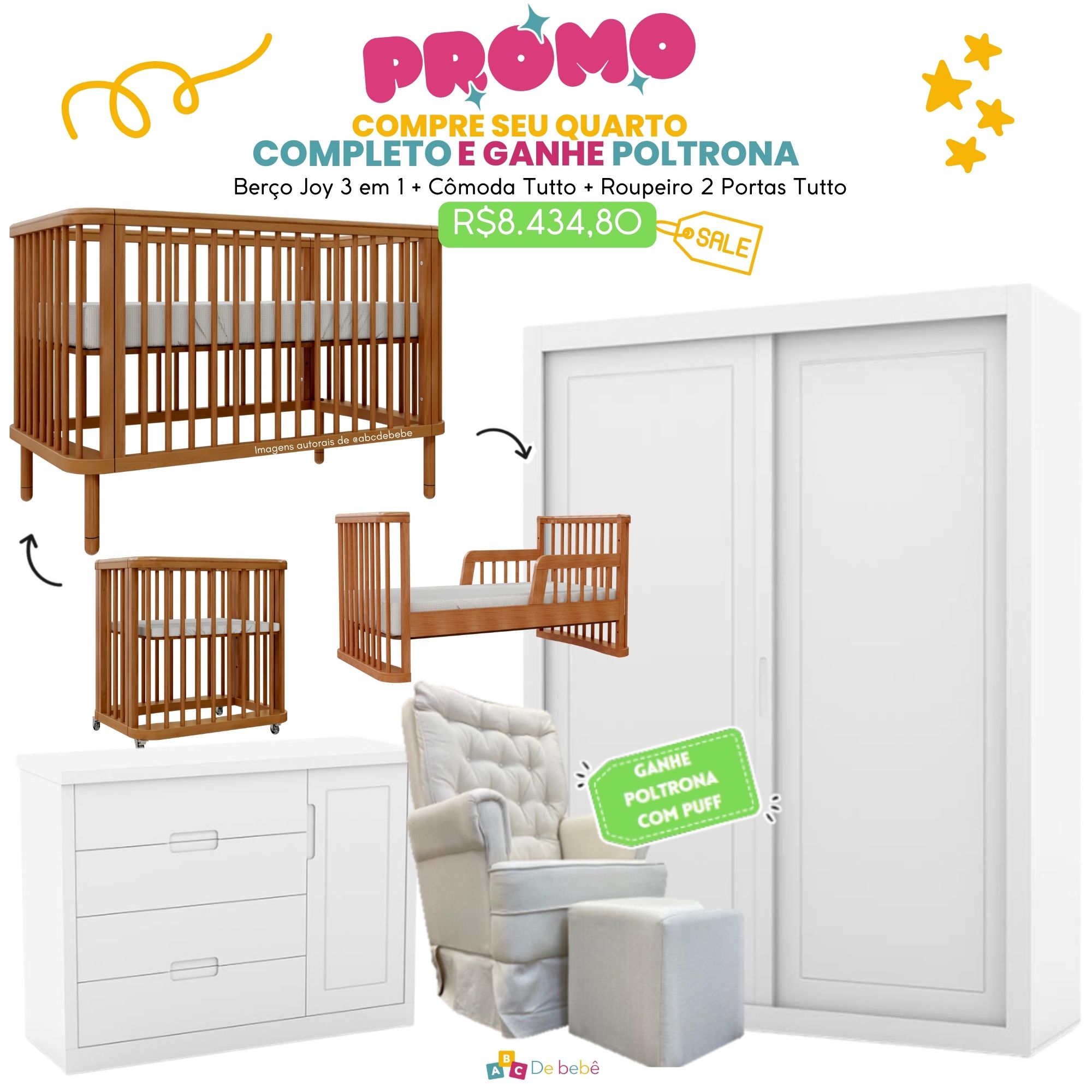 Na compra deste quartinho completo, os papais ganham uma poltrona com puff em linho bege de brinde.