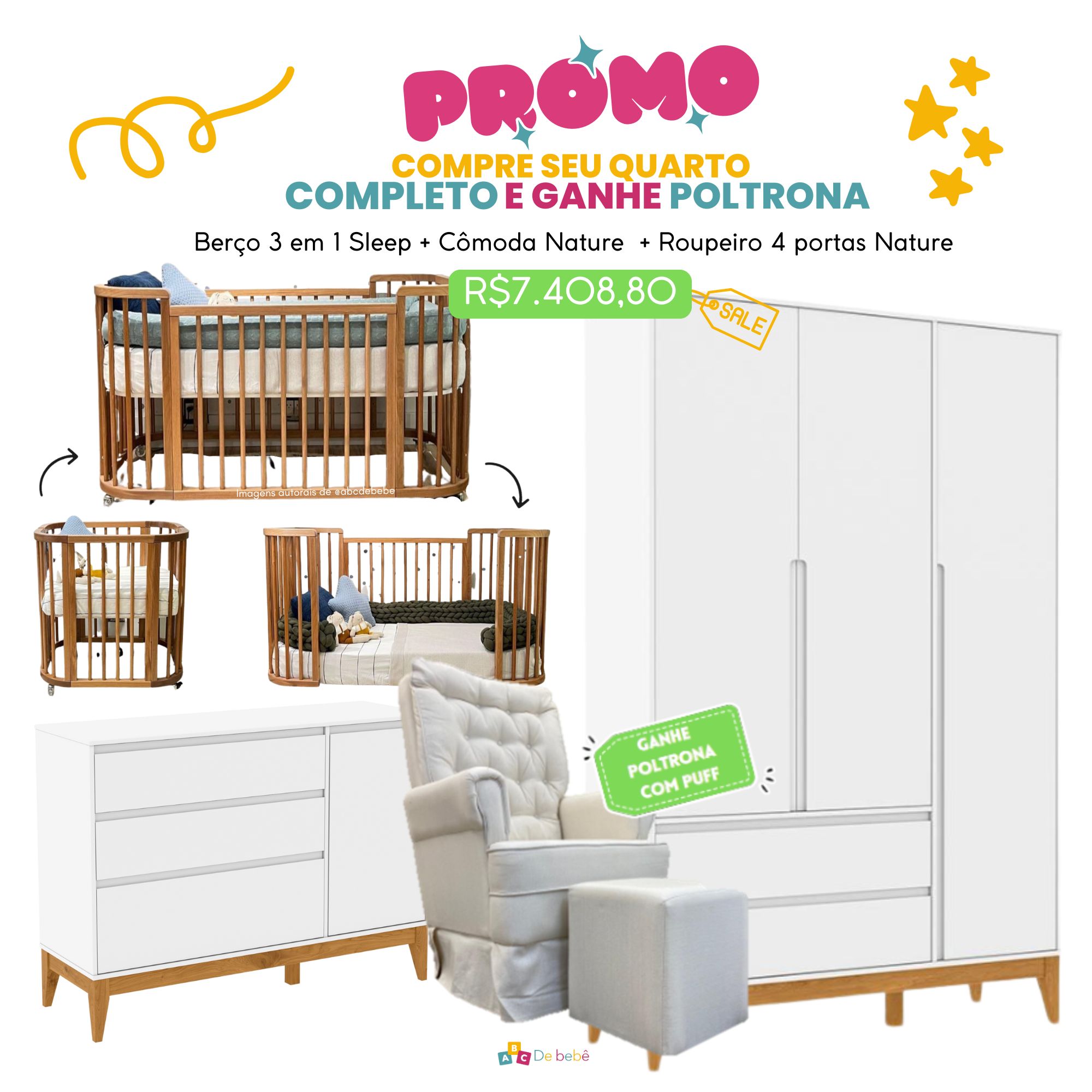 Na compra deste quartinho completo, os papais ganham uma poltrona com puff de brinde, no tecido Linho Bege, perfeita para amamentação e momentos de aconchego com o bebê.