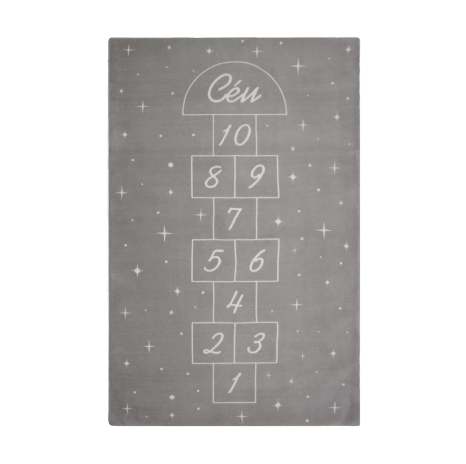 Quem nunca gostou de brincar de amarelinha quando criança? O tapete possui formato retangular com fundo cinza e detalhes em branco é perfeito tanto para quarto como brinquedoteca, as crianças vão adorar. Elaborado com fios 100% sintético, permite maior segurança para as crianças por pelo seu material hipoalergênico. Além de não soltar pelinhos, é muito fácil de limpar, facilitando a rotina diária e sendo sustentável, tanto pela durabilidade como pela economia de água nas lavagens.