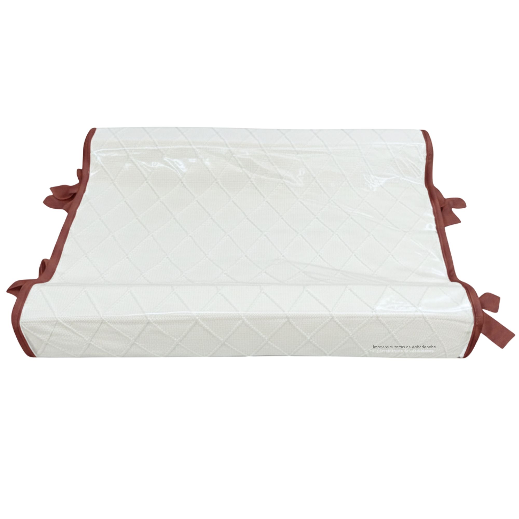 Confeccionado em tricô Seridó com trama em losangos, o trocador oferece um toque aconchegante e suave para a pele do bebê. Seu enchimento macio garante apoio confortável, enquanto a capa plástica transparente com bordinhas e laço de tricô protege contra líquidos e facilita a limpeza no dia a dia 🌿.