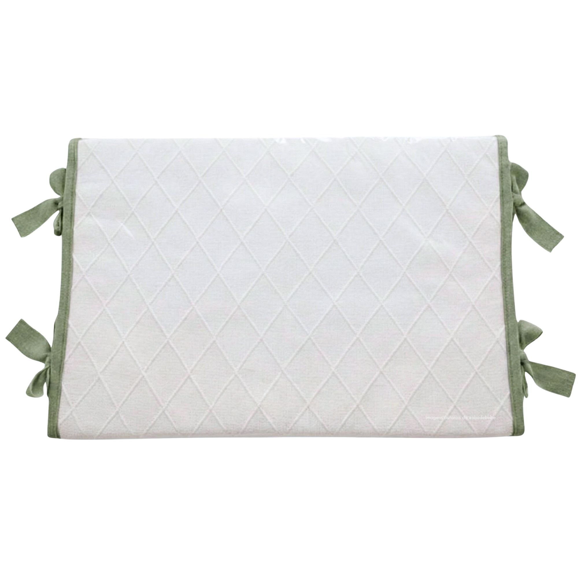 Com trama em losango e acabamento em laço de tricô, o trocador se destaca pelo visual charmoso e sofisticado, que harmoniza perfeitamente com qualquer estilo de quartinho. Acompanha uma capa plástica transparente com bordinhas, prática para proteger o tecido e facilitar a limpeza no dia a dia 🧺.