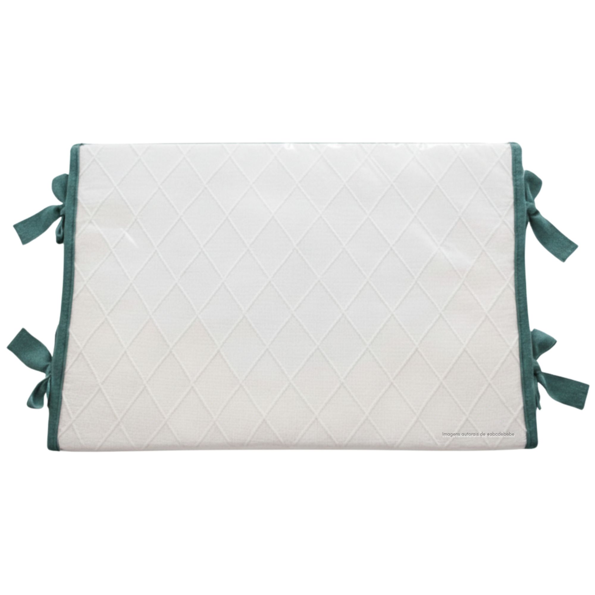 Com trama em losango e acabamento em laço de tricô, o trocador se destaca pelo visual charmoso e sofisticado, que harmoniza perfeitamente com qualquer estilo de quartinho. Acompanha uma capa plástica transparente com bordinhas, prática para proteger o tecido e facilitar a limpeza no dia a dia 🧺.