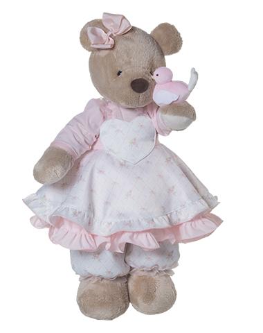 Adorável ursa de pelúcia para decorar as mais fofas decorações infantis. Sua roupa estampada com florzinhas bem delicadas e detalhes em rosa se completam com o fofo passarinho em sua mão. O suporte que a mantém em pé é vendido separadamente. Desenvolvido dentro dos padrões das normas técnicas brasileiras de segurança de brinquedos e acreditado pelos órgãos competentes, garantindo ser um produto seguro para todas as crianças a partir de 3 meses, manuseá-lo e brincar preservando sua integridade física e moral.